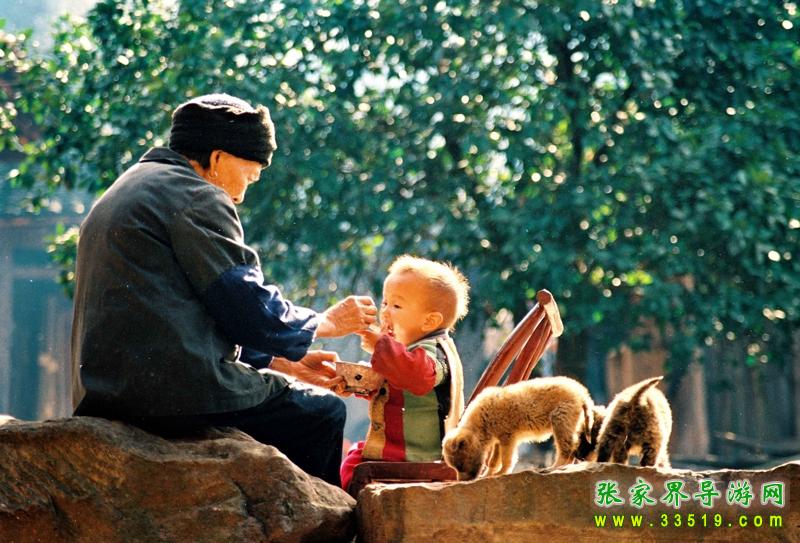 孩子們自從娘胎里出來,父母們就給備好了一首首童謠。在襁褓中時,有簡短的搖籃曲。“我的小寶貝,睡吧快快睡,你莫哭,快長大,我的小寶貝”,伴以“喲嗯”之類的喉音和鼻音??摁[的孩子在這低低的吟哦中,在這輕柔的春風(fēng)中,會緩緩的走入夢鄉(xiāng)。到孩子牙牙學(xué)語時,就會換上新的內(nèi)容。為讓孩子從小懂得廉恥,大人會教孩子《蟲蟲兒飛》:“打板板,逗蟲蟲兒,蟲蟲兒飛,飛到嘎兒(外公)去。嘎兒不趕,咬到蟲蟲兒的手;嘎兒不殺雞,蟲蟲兒不回去;嘎兒不打蛋,蟲蟲兒不吃飯;嘎兒不殺鵝,蟲蟲兒不過河。”(土家把孩子名字叫得賤,喊成“蟲蟲兒”)。在唱的同時手把手地教孩子做蟲蟲飛的動作。唱完后,又會用手指點(diǎn)點(diǎn)孩子的左右臉,刮一下孩子的鼻子,“這兒也丑,那兒也丑,鼻子刮豬油。”意思是好吃是丟臉的,蟲蟲兒可不能這樣。勤勞是做人的根本,也是土家人的傳統(tǒng)美德,“三歲看大,八歲看老”,大人會教些勤勞的童謠?!顿u豆腐》道:“一顆豆子圓又圓,推成豆腐賣成錢,別人講我生意小,小小生意賺大錢。”為讓孩子自小懂得親疏,教孩子《推磨》:“推磨拐磨,推的粑粑白不過。推粑粑,接嘎嘎,嘎嘎不吃娃娃的酸粑粑;推豆腐,接舅舅,舅舅不吃娃娃的酸豆腐;推合渣,接姨媽,姨媽不吃娃娃的酸合渣……”夏日的夜晚,一家人出來在月亮地里歇涼,有夜火蟲(螢火蟲)舉著火把飛來,母親會以夜火蟲打頭,以“一問一答”的聯(lián)句方式,考考孩子的記憶力:“夜火蟲,夜夜來,嘎婆接你吃茶來。什么茶?豆茶。什么豆?黃豆。什么黃?朱砂黃……”