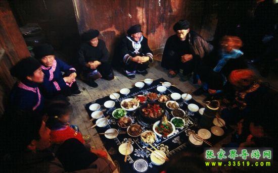 聚居于湘鄂川黔的土家族人過(guò)年,比其他民族要提前一二天。俗規(guī)農(nóng)歷臘月大,二十九過(guò)年,臘月小,則二十八過(guò)年,稱(chēng)為過(guò)“趕年”。 土家族有著趕年的習(xí)俗,在農(nóng)歷臘月三十的早晨,土家族家家門(mén)口,都是紅燈高掛,鞭炮齊鳴。因?yàn)槟鞘峭良易迦碎_(kāi)始趕年的時(shí)候,開(kāi)始吃午餐的時(shí)候。 土家人趕年時(shí),先把菜全部上桌后,再盛一碗飯,加一些葷菜,飯碗上放一雙筷子,那時(shí)土家人先祭拜他們的祖先,然后家人上桌開(kāi)始趕年。土家人年餐菜都必須是自家養(yǎng)的和自家產(chǎn)的,自家養(yǎng)的如豬、牛、羊、魚(yú)等,自家產(chǎn)的如紅薯粉、黃豆、青菜等等。 土家人的趕年餐每道菜都有它的含義。 土家三樣(血豆腐、臘豬干、臘香腸):當(dāng)土家兒女在桌上看到這三道菜時(shí)就會(huì)體會(huì)到父母一年來(lái)的辛勞。 土家紅曲魚(yú):這意味著年年有余。 大塊豬頭肉:豬頭肉在沒(méi)有切碎之前,先祭拜自家的祖先,然后切好上桌,是土家人在桌上吃的第一道菜,所以也稱(chēng)為土家第一肉。大塊臘肉在土家族是流行 365 天,無(wú)論你走在土家族哪一個(gè)村寨,餐桌上都少不了一碗大塊臘肉,這表示著土家漢子能吃能做,也意味著土家人對(duì)貴客的熱情招待。 香菇燉雞:一般在農(nóng)村土家父母平時(shí)總是舍不得宰殺自家的老母雞,因?yàn)檫@時(shí)候他們會(huì)想到身在他鄉(xiāng)的兒女們都在百忙的工作中,很少用高營(yíng)養(yǎng)的東西補(bǔ)給自己的身體。所以只有等到農(nóng)歷臘月三十也就是土家族趕年時(shí),土家父母才能盼到兒女們的團(tuán)聚,這時(shí)候就會(huì)毫不猶豫的將老母雞燉給兒女們吃。 另外,土家人年餐桌上都會(huì)有青菜、豆腐,這是意味著土家父母叫兒女們?cè)谕饷孀鍪缕狡桨舶?、清清白白?/p> 土家趕年餐全席食譜 第一道:土家臘豬肝 (原料:自制臘豬肝,自制鹽菜) 第二道:土家血豆腐 (原料:自制豆腐,花椒,辣子,陳皮) 第三道:土家香腸 (原料:豬小腸,瘦肉,花椒,辣子,陳皮) 第四道:土家紅曲魚(yú)(火鍋)(原料: 7 斤以上的草魚(yú),紅曲魚(yú)) 第五道:大塊豬頭肉 (原料:臘豬頭肉,干蔥頭) 第六道:大塊臘肉 (原料:自制臘肉,大蒜頭) 第七道:香菇燉雞 (原料:自產(chǎn)蘑菇,自養(yǎng)土雞) 第八道:雞湯紅薯粉 (原料:自制高湯,正宗紅薯粉絲) 第九道:米湯青菜 (原料:青排菜,米湯) 第十道:煎大塊豆腐 (原料:自制豆腐) 第十一道:土家美點(diǎn) (原料:粘米粉,糯米粉,黃豆粉,紅糖) 第十二道:農(nóng)家水果拼盤(pán) (原料:各種水果)