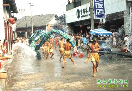 張家界潑水龍又叫“澆水龍”,于唐朝時期由移居本地的白族興起演變而成,在永定區(qū)的尹家溪鎮(zhèn)西尹村、莫家崗村十分盛行,是當(dāng)?shù)?a class="insidelink" href="http://m.daxueo.com/fengqing/1130174734.html" target="_blank" title="土家族">土家族,白族、苗族在天熱干旱時節(jié)求雨祈福的一種形式。一旦出現(xiàn)旱災(zāi),當(dāng)?shù)仡^面人物就會出來組織潑水龍,演出極其隆重。