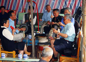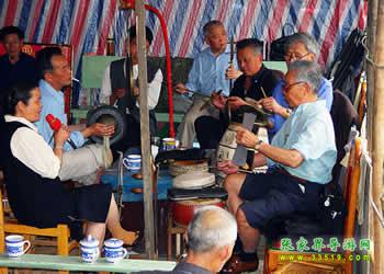 圍鼓(含嗩吶)。又稱打鎦子、打排鼓,是民間紅白會中不可缺少的樂器。一般7人演奏,樂器有一鼓、一大鑼、一公鑼、兩副鈸、兩嗩吶。其詞曲紅白會通用,以鼓和嗩吶上系紅、白布為分別標記(結婚不打四字鈸曲)。史傳的圍鼓詞有《撩子》、《火鋪》等,《撩子》分《一二三》、《閃翅》、《堆羅漢》、《反落花》等十章,《火鋪》也分《三槍》、《四進門》、《八哥洗澡》、《蓮魚吐絲》等十章,嗩吶詞有《八十正宮》調(diào)等。在農(nóng)村,圍鼓是最普及的樂器,每逢紅白喜事都有圍鼓和嗩吶表演。