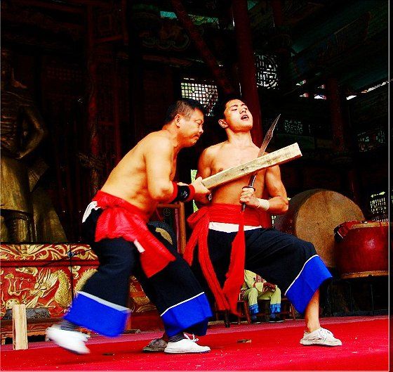 大庸氣功 大庸氣,堪稱武林奇葩,曾為祖國贏得聲譽(yù),海內(nèi)外享有極主名望。 大庸氣功是大庸各民族特別是土家族傳統(tǒng)體育項(xiàng) 目之了,分健體氣派、武術(shù)氣功兩類。前者有“返還 功”、“馬王推氣功”、“少林達(dá)摩醫(yī)療保健氣功” 等;后者有靜坐、壁虎、靈子、二指彈、碎石、松靜 、硬氣、五禽、五陽功等,尤以硬氣功著稱。大庸硬 氣功,歷史悠久,漢代相單程,明代覃后,清代劉明 燈,當(dāng)代湯子模、周鐵鞭、杜心武、趙繼書等都具有 超人硬氣武功。大庸土著民族在漫長(zhǎng)的反征服、反壓 迫斗爭(zhēng),博采武當(dāng)、少林南北派、昆侖派眾家武林精 華,創(chuàng)造出獨(dú)此一家的大庸硬氣功。 據(jù)傳,大庸硬氣功鼻祖是楚國鬼谷子。《永定縣 志》有關(guān)鬼谷子隱居天門山鬼谷洞潛心學(xué)《易》、傳 授方術(shù)的記載。到清代有武林高手朱茂嶺,隱居三岔 村北芭蕉灣洞,研究鬼谷氣功之術(shù),后收西溪坪胡口 子、余世萬(即“余通人”)為徙,傳其衣缽。余通 人將武術(shù)氣功系統(tǒng)整理,發(fā)揚(yáng)光大,播名于世。 新中國成立后,黨和政府十分重視民間氣功發(fā)掘 整理,并正式列為體育項(xiàng)目加以普及發(fā)展,今日大庸 市習(xí)練硬氣功達(dá)數(shù)萬人眾。永定區(qū)官黎坪村世有“硬 氣功之鄉(xiāng)”盛譽(yù),該村男女老幼,練功已蔚成風(fēng)氣, 其武師趙繼書,1979年先后參加全省和全國武術(shù)大賽 ,均獲一等獎(jiǎng),受到國家體委重視,同年7 月趙繼書 專程到北京給中央領(lǐng)導(dǎo)同志匯報(bào)表演。嗣后,隨同中 國武術(shù)代表團(tuán)和國家領(lǐng)導(dǎo)人先后兩次出國,到盧森堡 、意大利、比利時(shí)、羅馬尼亞、馬其他和東南亞等國 家訪問。他表演的臥刀碎石、頭頂開石、雙鳳灌耳、 頭碰石柱、叉尖推磨等精彩節(jié)目,博得外國友人好評(píng) 。盧森堡一位榮獲國家獎(jiǎng)牌的武士,看了表演后連夜 來到中國大使館,將自己珍藏多年的獎(jiǎng)牌贈(zèng)送給他; 盧森堡國王主動(dòng)熱情走上臺(tái)與趙繼書熱情擁抱,連連 稱贊:“了不起!了不起!國際氣功大師!”并把珍 藏紀(jì)念章一枚贈(zèng)送給趙繼書。一位法國朋友十分贊賞 說:“中國的氣功,稱為全人類的寶貴財(cái)富,是有科 學(xué)道理的。”自此,大庸硬氣功譽(yù)滿全球。湖南瀟湘 電影制片廠專門拍攝了彩色紀(jì)錄片《大庸氣功》。 大庸硬氣功共有二十多個(gè)項(xiàng)目,最有影響的是: 腹臥鋼叉 由二人在地面扶住一根叉尖朝上的三 股鋼叉,叉尖猁鋒利,然后一個(gè)俯身叉尖,尖抵腹部 ,待其四肢平展懸空,扶叉二人轉(zhuǎn)動(dòng)鋼叉,謂之推磨 。表演時(shí),要求臥叉者運(yùn)氣于腹,氣意集中,稍有大 意,叉即穿腹而過。 臥刀破石 先固定兩把大刀,刀口朝上,臥刀者 運(yùn)氣后,由其他人抬臥于刀口上(有仰臥、俯臥兩種) ,然后在臥刀者腹部或背部置一碩大石條(約數(shù)百斤) ,一人或兩人輪大鐵錘狠擊石條直至斷裂破碎為止。 釘?shù)洞财剖?地上倒一層碎玻璃片,一人仰臥其 上;然后腹上置釘床,又一人仰臥釘床上,再于第二 人腹上置釘床,第三人仰臥刀床上,腹部上壓一塊數(shù) 百斤大條石,由人掄錘狠砸,至石破為止。 銀槍刺喉 用一根兩頭安有鋒利槍頭的鋼槍,抵 置兩位表演者喉部,然后相對(duì)發(fā)力,至槍桿抵成彎弓 形而喉部安然無恙。 徙手?jǐn)嗍?表演者將堅(jiān)滑如鐵一塊卵石置于石凳 (地)上,然后運(yùn)氣于掌或指擊斷(碎)卵石。 踢腿斬石 表演者運(yùn)氣于腿,以腿踢斷石條。一 般可踢斷15公分以上厚度的麻石條或青石條。 胸部打刀 將鋒利大刀刃口置于胸部肌肉上,用 一根拳頭粗木棒猛擊刀背,至棒斷而胸部無傷。 新中國成立以來,大庸民間武術(shù)與民族體育逐漸 融為一體,發(fā)揮著提高人民身體素質(zhì)、弘揚(yáng)中華武術(shù) 傳統(tǒng)和增進(jìn)國際友誼重大作用。除硬氣功外,還有數(shù) 十種武術(shù)形式散見于民間武術(shù)體育活動(dòng)之中。如打飛 棒、扭扁擔(dān)、抵搭斗杠、擠油渣、甩抱腰、舉石鎖、 板牛角(一種斗牛形式)等等。其特點(diǎn)是因地制宜, 不分場(chǎng)地,凡田園地角院壩集鎮(zhèn),都是習(xí)武練功、開 展活動(dòng)的處所,頗具泥土氣息。擬或以生活中某些動(dòng) 作和動(dòng)物的某種形態(tài),稍加模仿演繹,便成某一獨(dú)特 武術(shù)形式。如天門武術(shù)功夫大師余道人所創(chuàng)造的“宮 天梳”、“巖燕樸天門”等;也有就地理特點(diǎn)創(chuàng)造某 種武功形式的,如“蕩藤”等。 以上部分圖片均來自互聯(lián)網(wǎng),出處不詳,請(qǐng)作者與本站聯(lián)系。 |