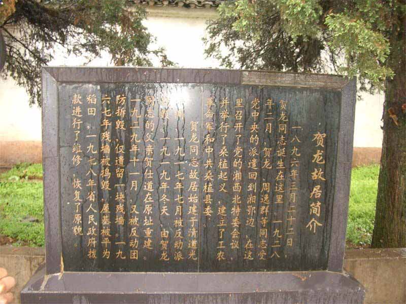 為了紀念偉大的革命元帥。1977年省縣兩級政府撥款,賀龍故居按舊居原貌修復(fù)的。賀龍紀念館于1996年3月25日賀龍誕辰100周年之際竣工落成,大門上首的墨色大理石匾額上,是江澤民親筆題寫的“賀龍紀念館”幾個燙金大字。。賀龍紀念館與賀龍故居、賀龍橋成犄角之勢。