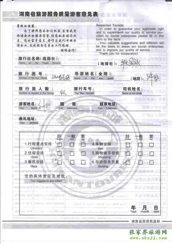 2010年8月5日劉先生一行4位旅游質(zhì)量反饋