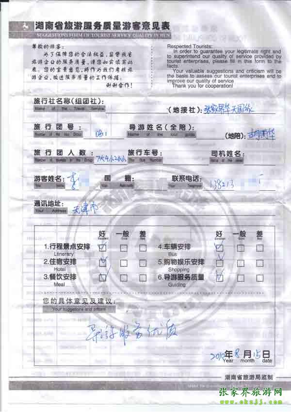 2010年8月15日天津李胡先生一行13位旅游質(zhì)量反饋:導游服務優(yōu)質(zhì)