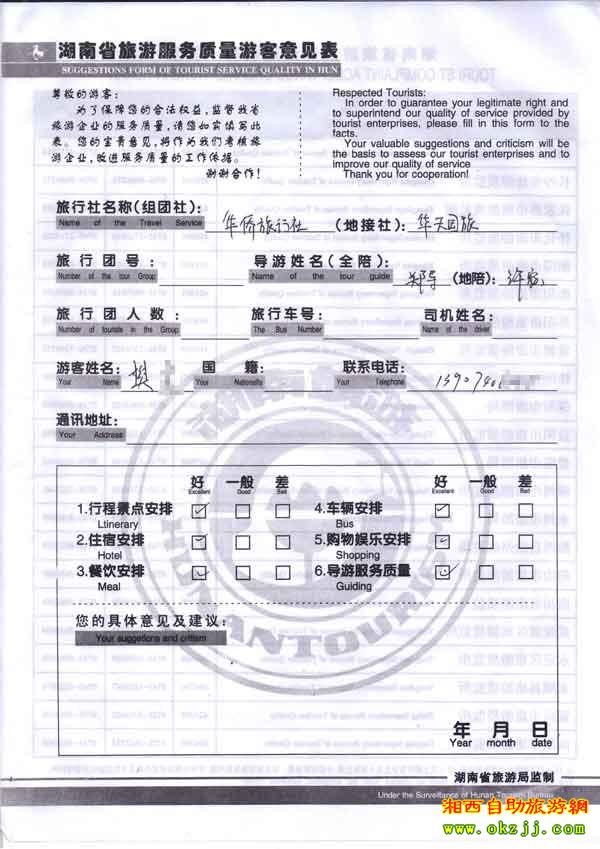 2010年5月11日岳陽樊小姐旅游質量反饋