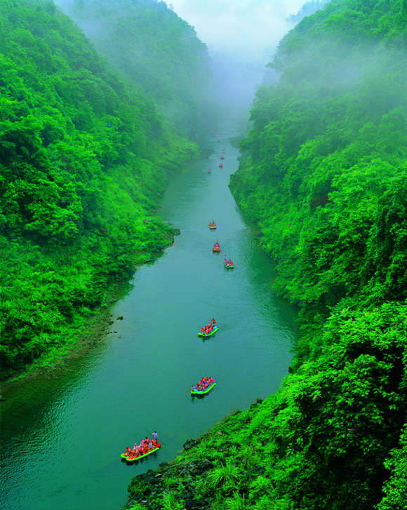 7點(diǎn)準(zhǔn)時(shí)等在萊頓大酒店門口,猛洞河漂流180元/人,漂流的車一般會(huì)來(lái)接參加漂流的客人的,上了車已經(jīng)有好幾位游客,然后車子又去接了幾位,7:30人接齊,離開張家界去猛洞河,車程約1個(gè)半個(gè)小時(shí),漂流約2個(gè)半小時(shí)。在萊頓大酒店的那個(gè)晚上張家界半夜打雷下雨,我們想今天水很大,漂流會(huì)很刺激。到了那邊才知道上游建了水壩調(diào)節(jié)水量搞平均主義,所以漂流的驚險(xiǎn)度一般般了,后來(lái)去鳳凰公路上比較顛簸,我戲稱可以將車當(dāng)船補(bǔ)足漂流的感覺(jué),呵呵。不過(guò)瀑布因此壯觀不少,漂流沿途至少見到有七八條瀑布,非常漂亮。