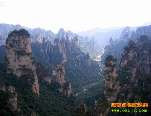 早上9點在路邊等旅游車(山上的車費包括在門票中),路邊已經站著很多住山上的自助游的游人,我們等了15分鐘才上車,大約20分鐘后在神堂灣下車,一個極具神秘色彩的地方,相傳明朝初土家族的一個古代首領向王天子兵敗受困于神堂灣,終支持不住整支軍隊跳崖自殺,每當陰雨天或者天氣突變的時候,就能隱約聽到崖底人喊馬嘶的聲音……離神堂灣不遠的地方是點將臺,下面的四十八將軍巖栩栩如生,就像一個個整裝待發(fā)的將兵。接著我們走到賀龍公園,旅行團去的地方,可想而知,到處是人,韓國人居多,這兩天見到的韓國人比中國人多,景區(qū)的韓國文字到處可見,連小販都能用韓語招攬生意,可見張家界在韓國的宣傳力度之強。這的景色一般,撥開人群,看看仙女散花和御筆峰,走人。中飯就在不遠處的小餐館里解決。   飯后快12點了,向導帶我們去的是天子山的精華景點大觀臺,入口在公路旁邊,沒任何標志,如果沒有向導,很難發(fā)現這里進去是個絕佳的景點。去那的人極少,可以很清凈地觀賞美景。坐了一會的旅游車,就到了大觀臺的路口,我們沿著路走進去,看到大觀臺的牌子,有三個年輕人在路邊休息,我們開始下石梯,剛好有對中年夫妻已經上來了,他們都是早上下去游玩的,看他們氣喘吁吁的樣子就知道下面的行程有多累。之后我們六人再也沒遇上任何游人。走了無數階梯和平板路,看見上鎖的廁所、關閉的商鋪和地上無人清理的樹枝就知道這里真是很少有人來。   我們先到仙人橋,一座比天下第一橋更加險峻的窄石橋,石橋前圍著鐵絲提醒游人這里危險!長10多米,寬不過1米的天然石橋,下面是350米深的山谷,兩旁四面皆無護欄,走在上面如果一不小心就會做自由落體運動。接著是天子座,四周有圍欄,左右兩邊都是空曠的山谷,這里的景色也很美。第三個景點是一步難行,兩座山之間,是一米多的距離,下面是深淵,如果一步不夠大,就摔下去了,據說從前曾經有幾個人從這里掉下去,之后再沒人敢過去,后來修了鐵橋,不過走在鐵橋上,我還是感覺腳下涼颼颼的有些害怕。最后一個景點是神雞啄食,這里可以遠眺干枯的十里畫廊。   回程的路上,兩旁樹叢中不斷有細細簌簌的聲音,估計是小鳥、松鼠之類的小動物,走著走著又聽見聲音,回頭看看,輕輕對我說:“蛇” 我回頭撇了一眼,看不是很清楚,象蛇的形狀,“啊”的一聲我們倆迅速沖向前面,以前還不知道自己原來可以跑得這么快,還好蛇沒跟上來,呵呵,之后向導就和我們聊起關于山中蛇的話題?;厝ロ斨胰詹粩嗟嘏离A梯,好累!雖然累,對這兩天走的景點非常滿意,沒有讓我們失望。到路邊等車時已經下午3點了,我們在大觀臺走了三個小時,也暴曬了三個小時,回到住處時發(fā)現臉上都曬得脫皮了,嗚嗚!今天太累了,回去就倒頭大睡起來。