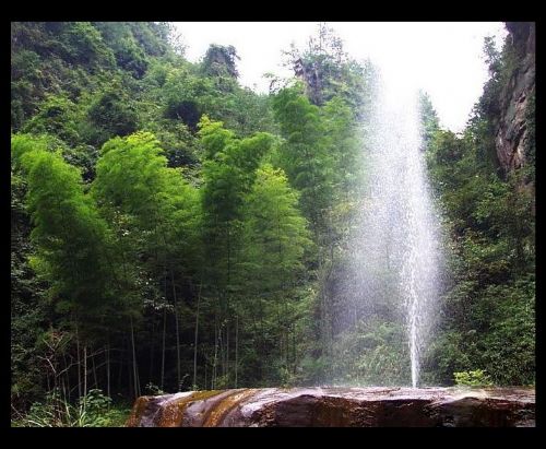 寶峰飛瀑:寶峰橋左前方山腰4O余米處,一水飛流而下,如同一條銀色絲帶掛在峭壁之上。瀑布先直瀉,后順坡漫灑于鐵索橋處池中。兩水池相疊,波光盈盈,翠竹、紅樹、人影盡映其中,宛若畫盤。書法家沈鵬游覽寶峰湖后題—“飛流界峰”四字,鐫刻于飛瀑石上方峭壁。