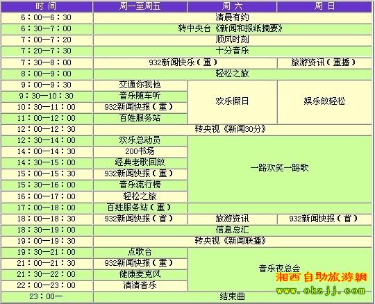 張家界旅游交通頻道茲定于四月八號試播,頻率為FM93.2兆赫和103.2兆赫。頻道以立足旅游交通、服務(wù)百姓大眾為宗旨,設(shè)置了《清晨有約》、《順風(fēng)時刻》、《932新聞快報》、《輕松之旅》、《交通你我他》、《百姓服務(wù)站》、《歡樂總動員》和《音樂隨車聽》等欄目。屆時,聽眾可以通過熱線電話、短信平臺以及網(wǎng)絡(luò)廣播等多種途徑參與到電臺節(jié)目中來,在第一時間了解新聞動態(tài),掌握市場信息,享受娛樂休閑。